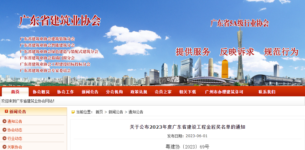 “金匠獎”和“優質獎”是廣東省建筑行業工程質量的最高榮譽獎,每年評選一次。評選工作由廣東省建筑業協會組織實施,評選活動接受廣東省建設行政主管部門的監督和指導,評選結果經省建設行政主管部門備案后公布。評選對象為中國建筑施工企業在廣東省境內承包施工的,并已經建成投入使用一年,其質量達到省內一流水平的各類工程。