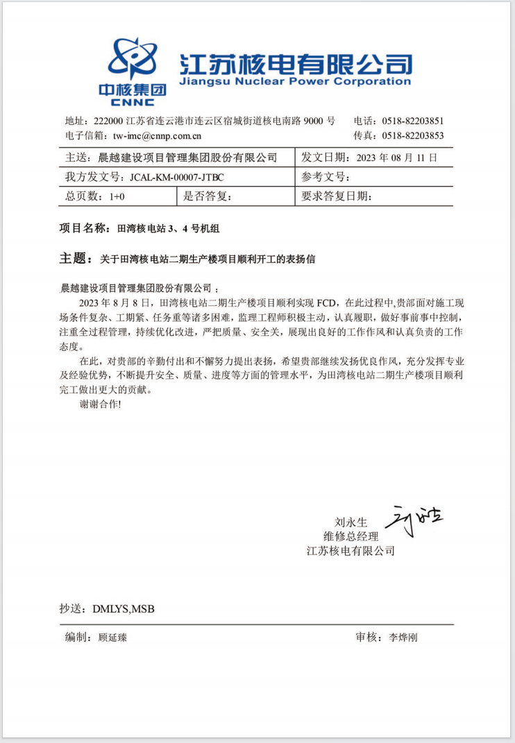 8月11日,集團收到江蘇核電有限公司發來的表揚信,對晨越及項目團隊前期的辛勤付出表示感謝。此次榮獲表揚信是對晨越項目團隊“主動務實、積極進取”工作作風的充分肯定!