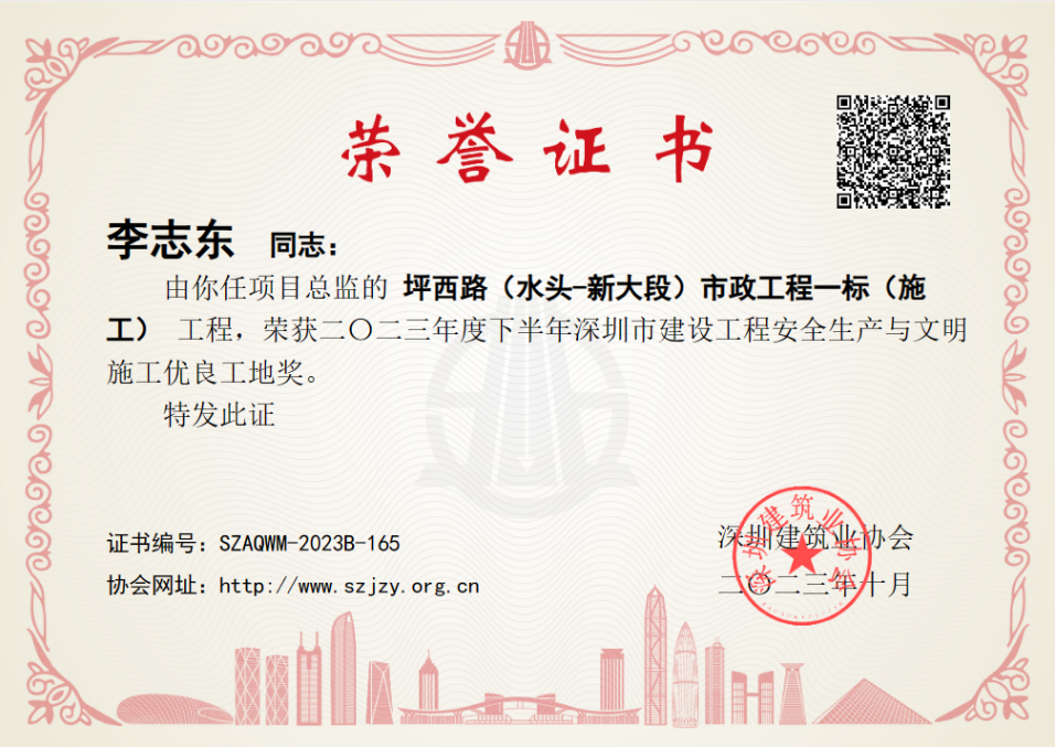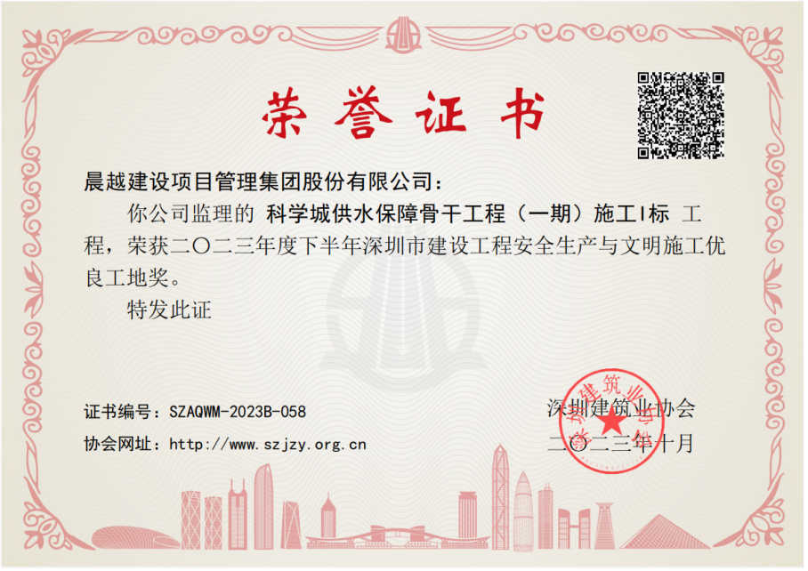 晨越建管集團項目部喜報連連!繼集團深圳市濱河水質凈化廠提標擴建工程項目獲“深圳市建設工程安全生產與文明施工優良工地獎”后,近日,集團坪西路(水頭-新大段)市政工程、大鵬新區養老院工程項目、科學城供水保障骨干工程(一期)三項目再獲深圳市建筑業協會頒發的“2023 年下半年度深圳市建設工程安全生產與文明施工優良工地獎”。