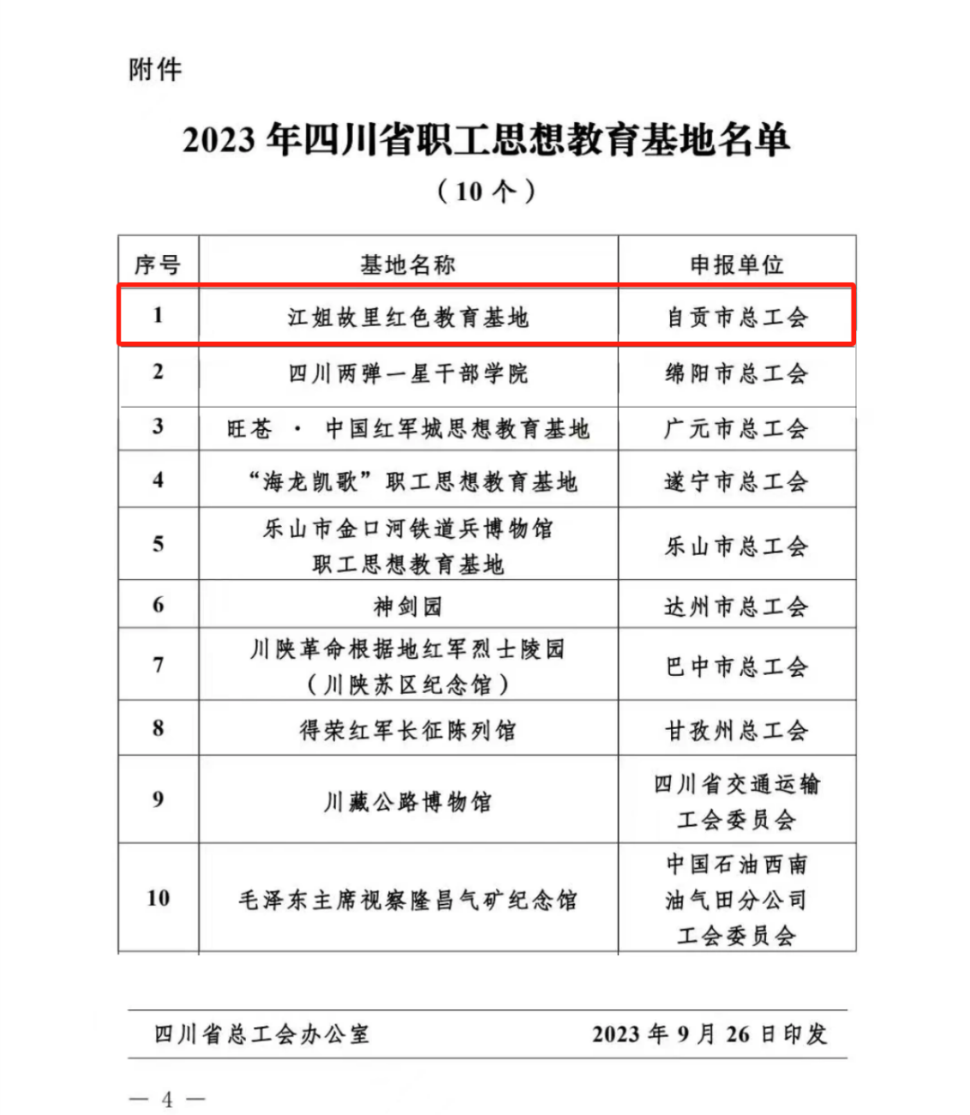 四川省總工會印發《關于命名2023年四川省職工思想教育基地的通知》,公布了2023年“四川省職工思想教育基地”名單,江姐故里紅色教育基地榜上有名。