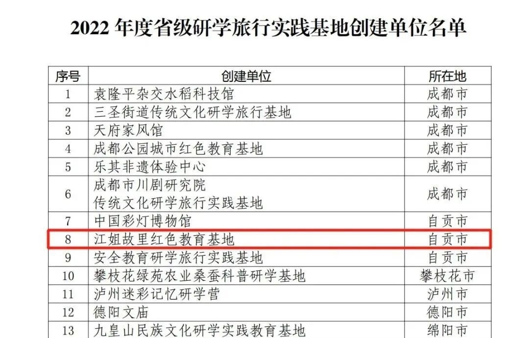 根據四川省文化和旅游廳、四川省教育廳公布“2022年度省級研學旅行實踐基地創建單位名單”,江姐故里此前經過自助申報、市(州)文旅和教育主管部門聯合初審推薦、文化和旅游廳與教育廳組織評審合議后成功上榜!