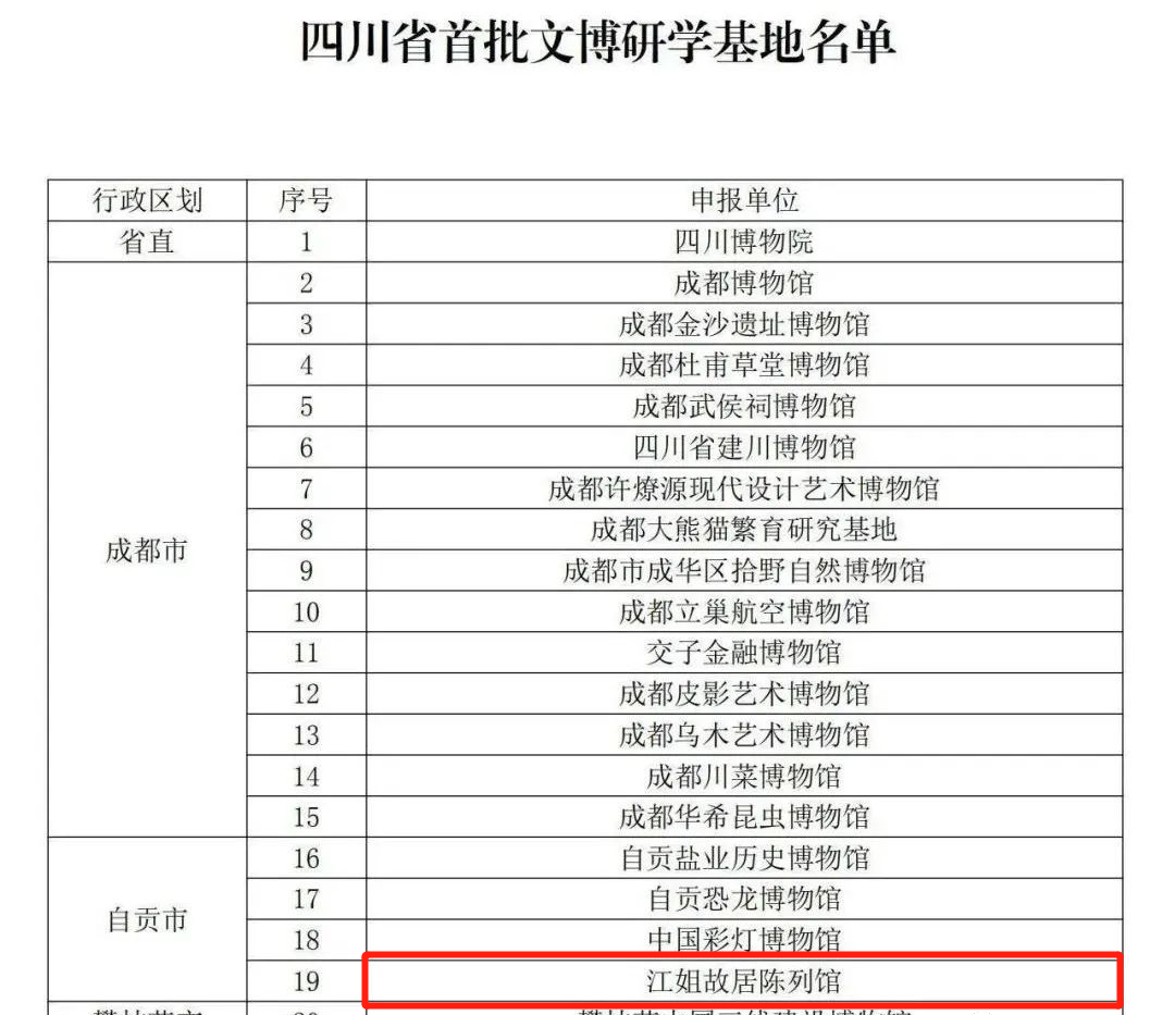 四川省文物局網站公示四川省首批文博研學基地及優秀文博研學課程。其中,有45個館擬入選文博研學基地,100個研學課程擬入選優秀文博研學課程。江姐故居陳列館成功入選。