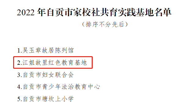 根據四川省婦女聯合會、四川省教育廳聯合公示“四川省家風家教創新實踐基地”入選名單,江姐故里紅色教育基地成為自貢市10個入選地之一。同時,據自貢市婦女聯合會、自貢市教育和體育局、自貢市民政局、自貢市人民政府婦女兒童工作委員會辦公室《關于命名自貢市家校社共育實踐基地的通知》,江姐故里成功入選。