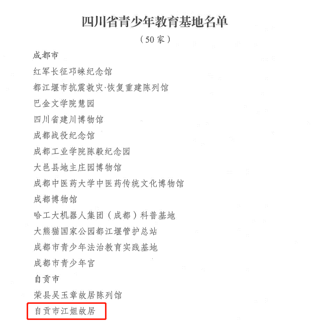 四川共青團發布了《關于命名四川省青少年教育基地的決定》,命名31個申請復核的單位和19個新申報的單位為“四川省青少年教育基地”,其中,自貢市江姐故居榮幸上榜。