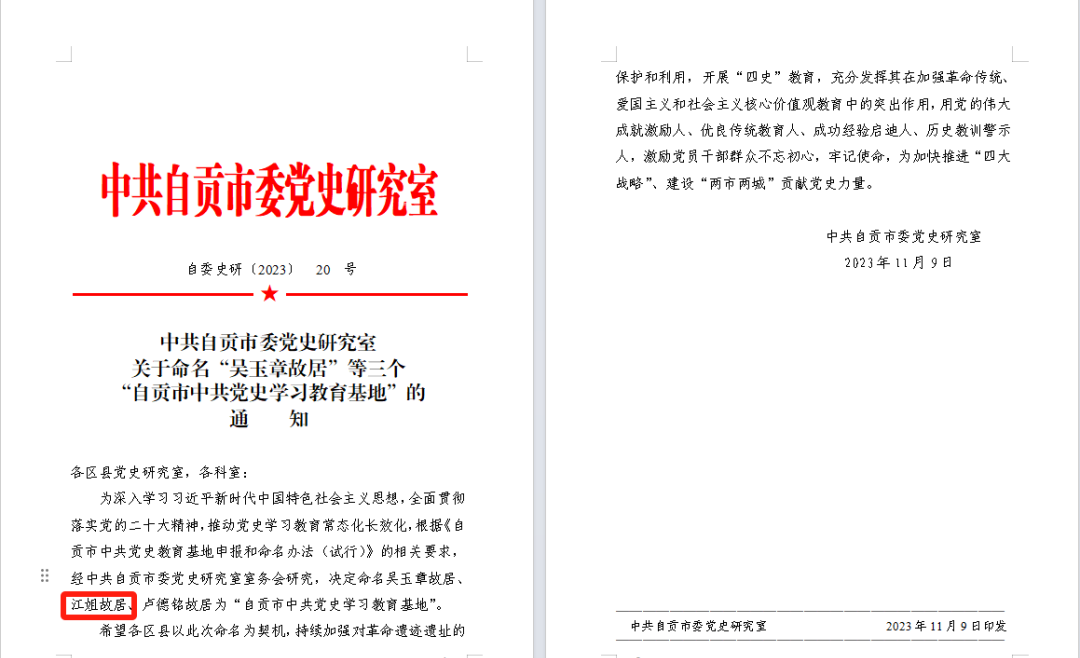 中共自貢市委黨史研究室公布“自貢市中共黨史學習教育基地”名單,江姐故居光榮上榜。