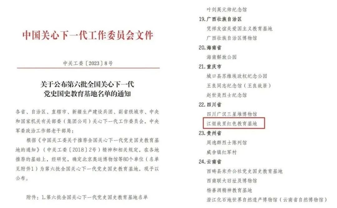 中國關心下一代委員會發布《關于公布第六批全國關心下一代黨史國史教育基地名單的通知》,確定北京奧運博物館等80個單位為“第六批全國關心下一代黨史國史教育基地”。其中,四川省共2個單位入選,江姐故里紅色教育基地成功上榜。