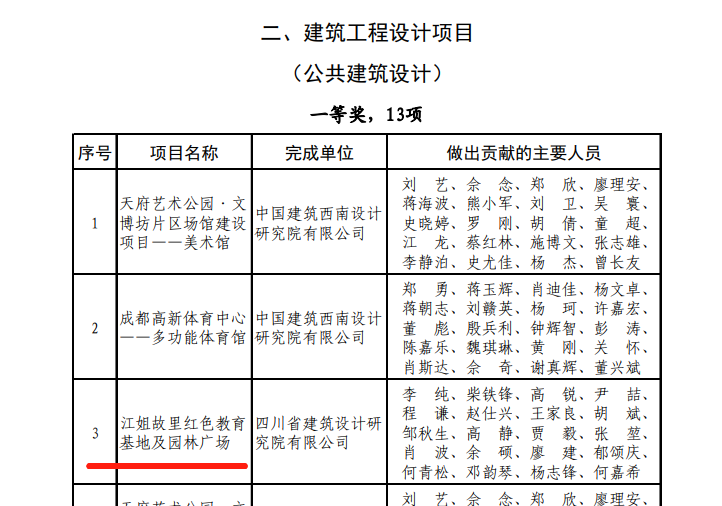 四川省勘察設計協會官網公布《2023年度四川省優秀工程勘察設計項目評定結果的通知》,江姐故里榮獲“2023年度四川省優秀工程勘察設計項目公共建筑設計一等獎“。