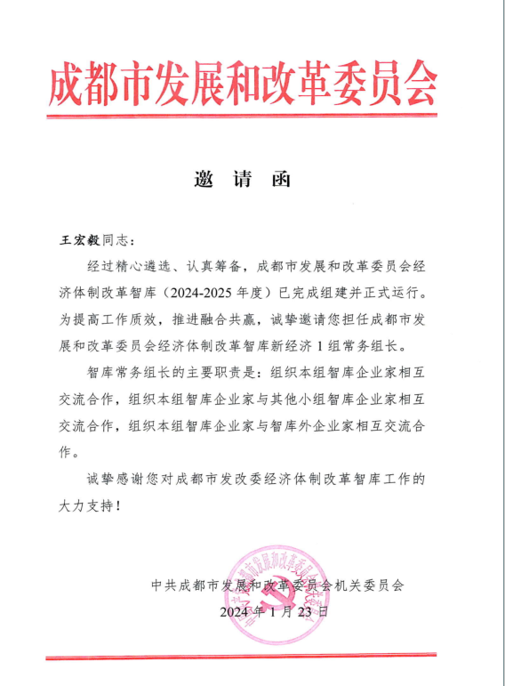 近日,集團黨委書記、董事長王宏毅收到成都市發展和改革委員會《邀請函》,受邀擔任成都市發改委經濟體制改革智庫(2024-2025年度)新經濟1組常務組長,組織本組智庫企業家及智庫外企業家交流合作。