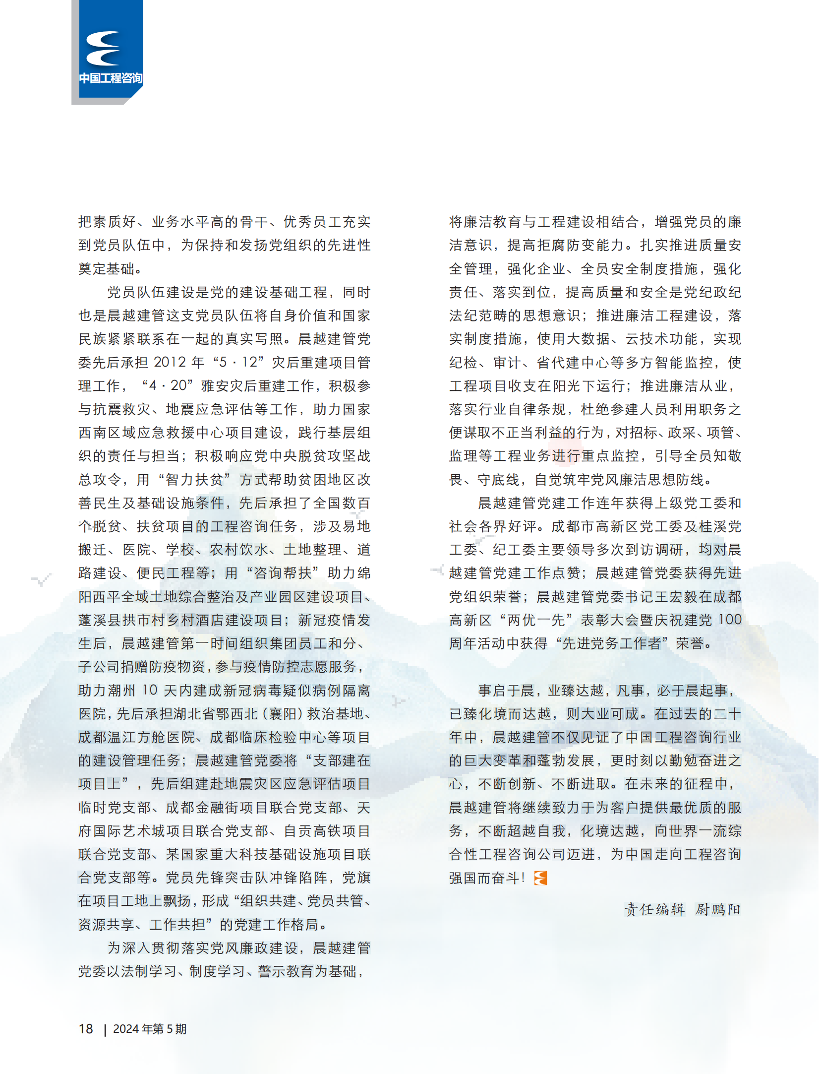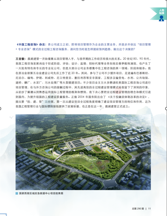本期雜志在“卷首語”之后,“人物縱橫”專題大篇幅報道集團黨委書記、董事長王宏毅專訪文章:“向世界一流綜合性工程咨詢公司邁進”,對晨越建管集團創新發展歷程及取得的成績進行了全面介紹,充分展現了晨越建管集團作為全過程工程咨詢行業先行者和領軍企業在工程咨詢業轉型升級和高質量發展中所取得的卓越成就和創新發展理念。