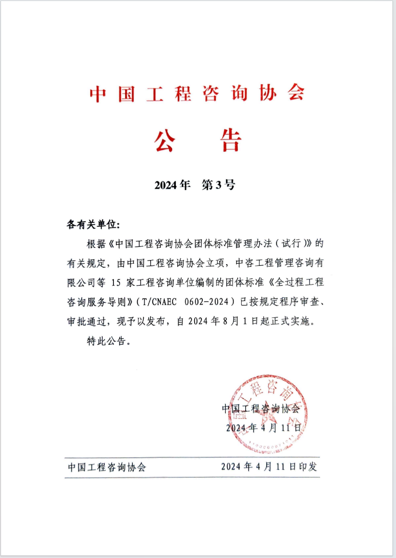 【晨越動態】集團聯合主編中咨協團體標準《全過程工程咨詢服務導則》(T/CNAEC 0602-2024)正式發布實施