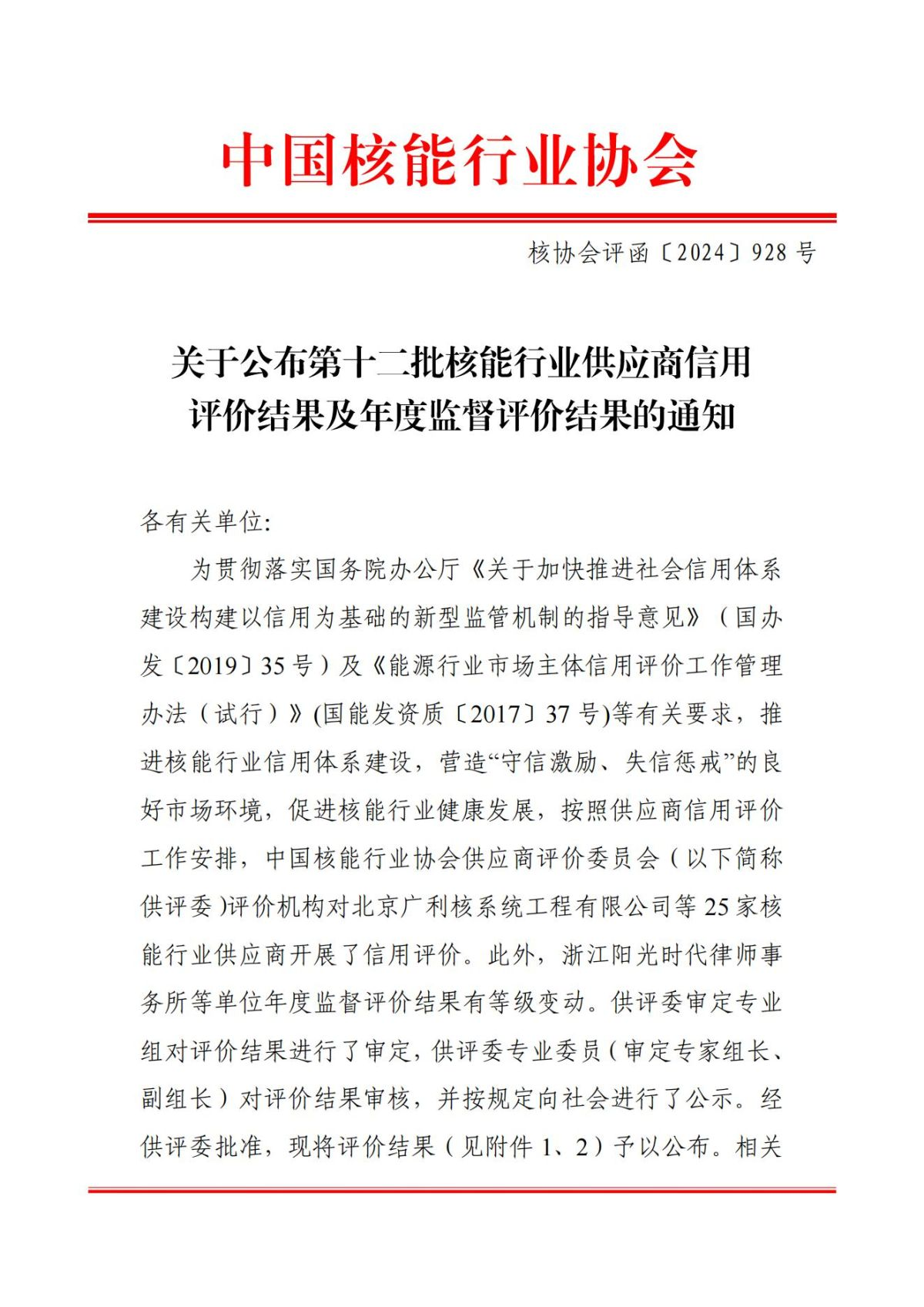 為貫徹落實(shí)國務(wù)院辦公廳《關(guān)于加快推進(jìn)社會信用體系建設(shè)構(gòu)建以信用為基礎(chǔ)的新型監(jiān)管機(jī)制的指導(dǎo)意見》、《能源行業(yè)市場主體信用評價(jià)工作管理辦法(試行)》,推進(jìn)核能行業(yè)信用體系建設(shè),營造“守信激勵(lì)、失信懲戒”的良好市場環(huán)境,促進(jìn)核能行業(yè)健康發(fā)展,中國核能行業(yè)協(xié)會供應(yīng)商評價(jià)委員會評價(jià)機(jī)構(gòu)對核能行業(yè)供應(yīng)商開展了信用評價(jià)。經(jīng)過嚴(yán)格的審核,最終確定晨越建管集團(tuán)為AA+信用等級評價(jià)。