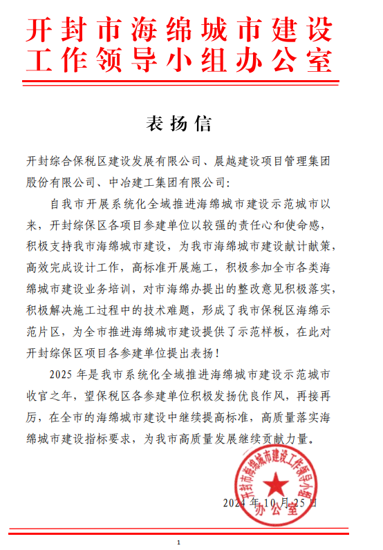 圖/開封市海綿城市建設(shè)工作領(lǐng)導(dǎo)小組辦公室《表揚(yáng)信》