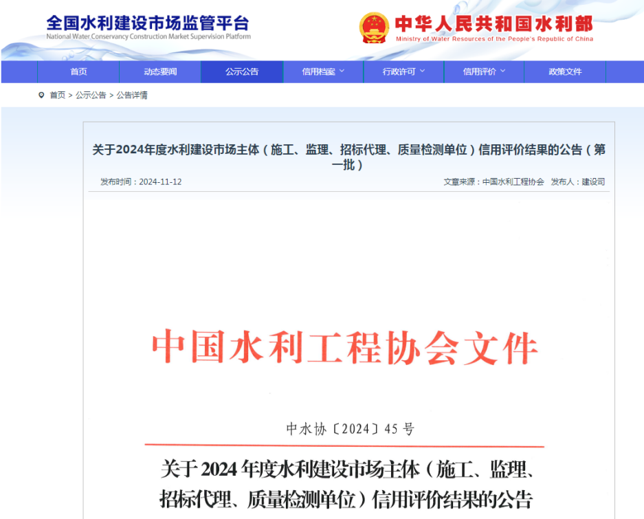 近日,全國水利建設市場監(jiān)管平臺官網(wǎng)發(fā)布《中國水利工程協(xié)會關于2024年度水利建設市場主體(施工、監(jiān)理、招標代理、質(zhì)量檢測單位)信用評價結果的公告》,晨越建管集團獲評2024年度水利建設市場主體信用評價AA級。
