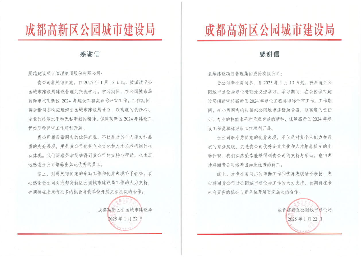 近日,晨越建管集團收到來自成都高新區(qū)公園城市建設(shè)局的《感謝信》,對集團員工李小勇和蔣辰鍇支持高新區(qū)2024年建設(shè)工程類職稱評審工作表示誠摯的感謝。