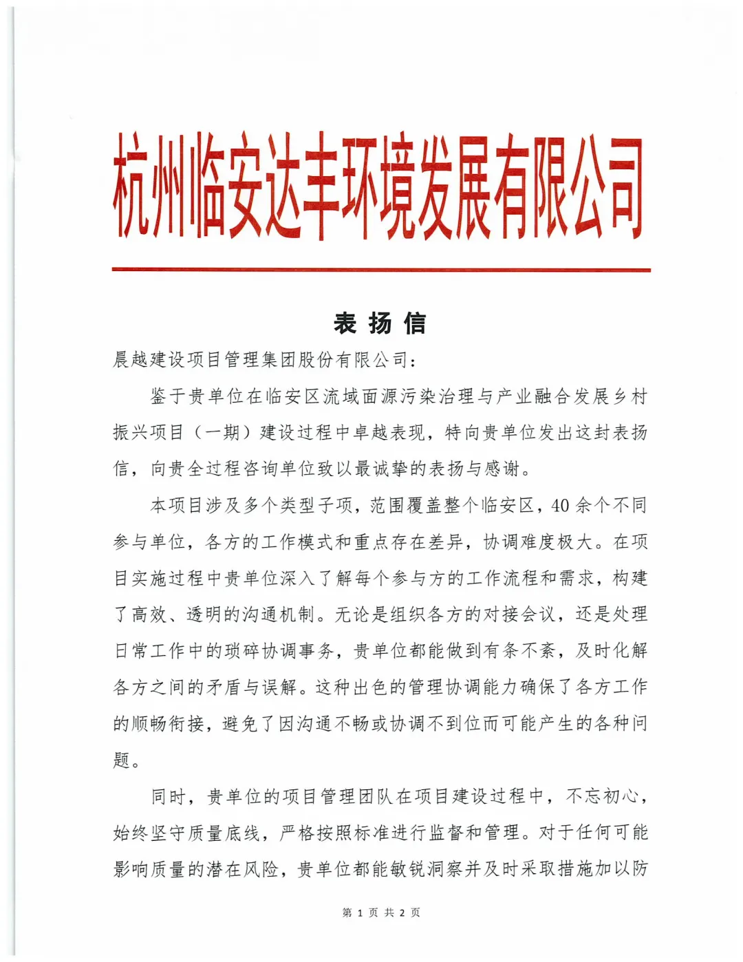 臨安區(qū)流域面源污染治理與產(chǎn)業(yè)融合發(fā)展鄉(xiāng)村振興項(xiàng)目(一期)涉及多個(gè)子項(xiàng),覆蓋整個(gè)臨安區(qū),參與單位多達(dá)40余家,晨越項(xiàng)目團(tuán)隊(duì)在項(xiàng)目建設(shè)過程中,始終堅(jiān)守質(zhì)量底線,嚴(yán)格按照標(biāo)準(zhǔn)進(jìn)行監(jiān)督和管理,并將以此項(xiàng)目經(jīng)驗(yàn)為基礎(chǔ),進(jìn)一步優(yōu)化全過程咨詢服務(wù)體系,重點(diǎn)攻關(guān)“跨領(lǐng)域協(xié)同”與“智慧化管理”技術(shù),助力鄉(xiāng)村振興與生態(tài)治理項(xiàng)目提質(zhì)增效。《表揚(yáng)信》中特別指出:“晨越團(tuán)隊(duì)以極強(qiáng)的統(tǒng)籌能力,將碎片化工作整合為高效協(xié)同的整體,為項(xiàng)目順利推進(jìn)提供了關(guān)鍵保障。”