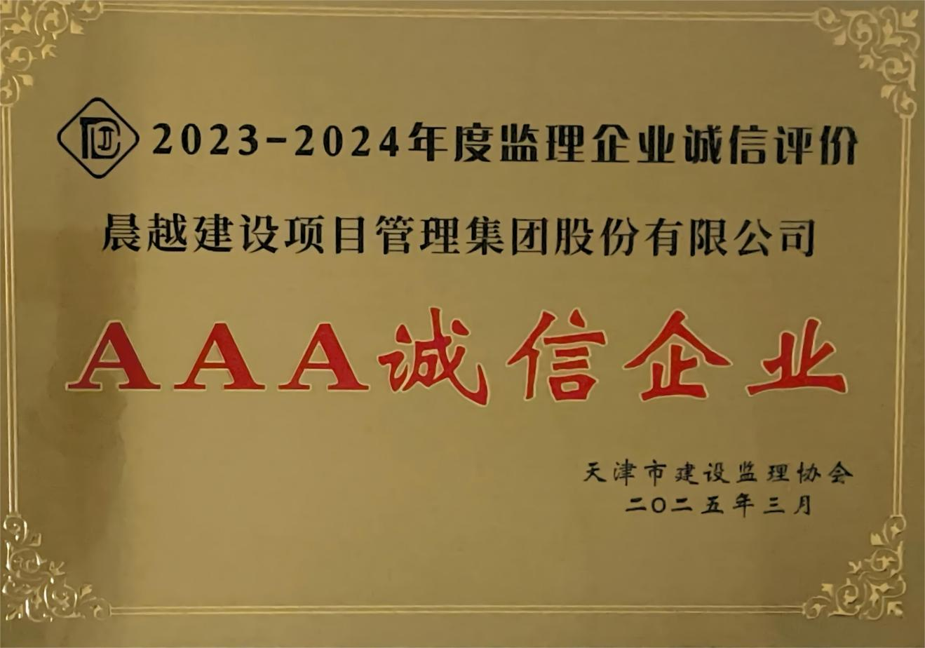 【晨越動態(tài)】集團榮獲天津市“2023-2024年度監(jiān)理企業(yè)AAA誠信企業(yè)”稱號