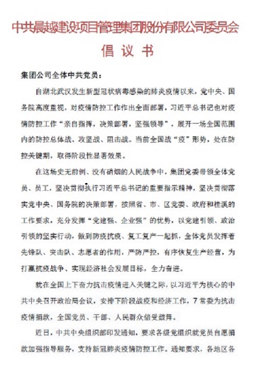 疫情就是命令,抗疫就是戰(zhàn)爭!晨越集團(tuán)黨委書記、董事長王宏毅帶領(lǐng)集團(tuán)第一時(shí)間投入防控疫情的戰(zhàn)斗。通過落實(shí)系統(tǒng)、技術(shù)措施、密集的管理,嚴(yán)防嚴(yán)控疫擴(kuò)散,保障企業(yè)抗疫到位,全員安全,社會(huì)靜好。通過組織活動(dòng)以繼續(xù)深化“兩學(xué)一做”、“四個(gè)意識(shí)”、“四個(gè)自信”“兩個(gè)維護(hù)”為指導(dǎo),全體黨員按照公司黨委、各黨支部的激勵(lì)、安排,發(fā)揮先鋒隊(duì)、突擊隊(duì)、志愿者作用,為抗疫、為生產(chǎn)經(jīng)營“開門紅”貢獻(xiàn)力量。