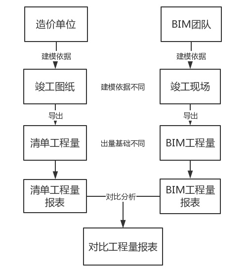 在對量的過程中,兩者的對量基礎(chǔ)始終與清單計價規(guī)范的要求保持一致,但BIM團隊主要參考竣工現(xiàn)場作為模型的搭建依據(jù),兩者的建模依據(jù)不同,出量基礎(chǔ)也不同(詳見圖7)。