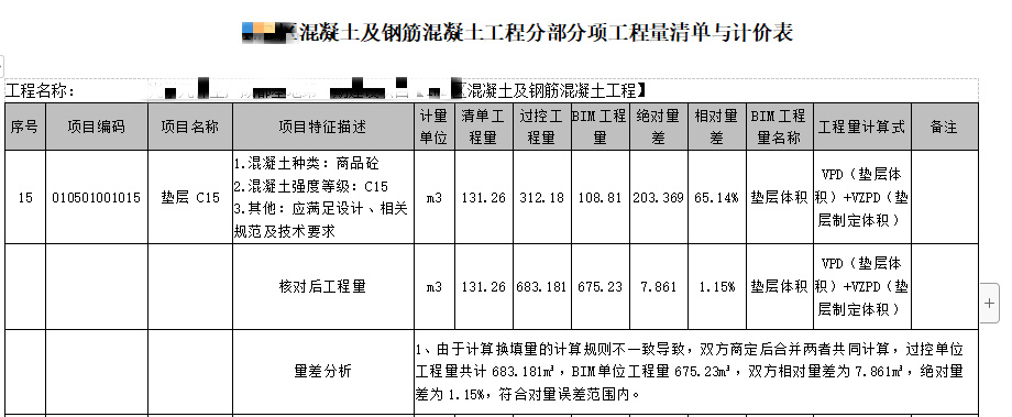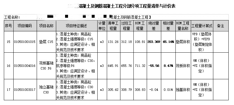 圖4 混凝土及鋼筋混凝土工程BIM工程量對量報表(第一版)部分截圖