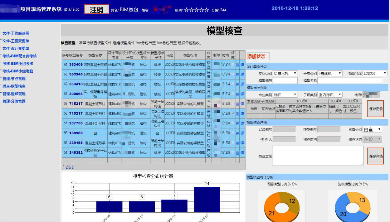 面對處理如此龐大的核查數(shù)據(jù),同時也為了避免核查數(shù)據(jù)的丟失,方便于現(xiàn)場模型核查數(shù)據(jù)的快捷統(tǒng)計,BIM團隊創(chuàng)建了與項目現(xiàn)場實際相符合的信息錄入平臺(詳見圖8),錄入的基礎(chǔ)基于設(shè)計院出具的軸網(wǎng)、專業(yè)劃分確定具體位置,變更現(xiàn)場的核查,工程進度的核查,均登記于該平臺中,同時分配權(quán)限給現(xiàn)場的參建單位,模型核查的結(jié)果將同步更新到現(xiàn)場所有參建單位,模型與現(xiàn)場不符時,分析差別因素,并通知相關(guān)責(zé)任單位進行整改回復(fù)。