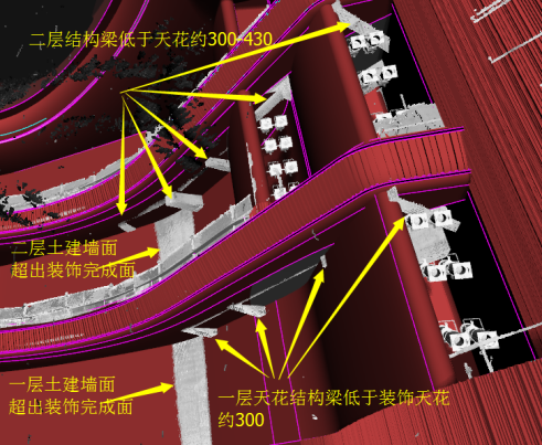 為避免精裝修與土建結(jié)構(gòu)的沖突碰撞,精裝修施工前對現(xiàn)場土建完成結(jié)構(gòu)進(jìn)行實測復(fù)核。通過三維激光掃描儀對觀演廳內(nèi)土建結(jié)構(gòu)進(jìn)行實測掃描,獲得廳內(nèi)三維點云數(shù)據(jù)模型,結(jié)合裝飾裝修的BIM模型,進(jìn)行主體結(jié)構(gòu)與裝飾設(shè)計造型的碰撞檢查。