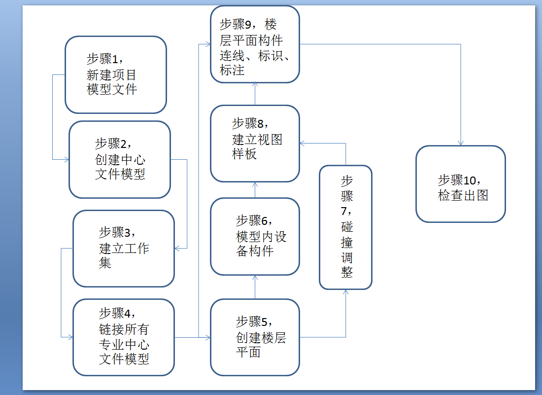 步驟1,建議采用已有項(xiàng)目樣板或者Revit自帶的項(xiàng)目樣板,可節(jié)省部分工作量。步驟2,應(yīng)采用正確以及統(tǒng)一的方式方法創(chuàng)建中心模型文件,否則可能會(huì)導(dǎo)致各專業(yè)項(xiàng)目基點(diǎn)不一致的情況發(fā)生,從而影響后面的模型鏈接。步驟3,標(biāo)高和軸網(wǎng)應(yīng)為單獨(dú)工作集,鏈接各專業(yè)模型應(yīng)為單獨(dú)工作集,其余見后續(xù)工作集相關(guān)規(guī)則方法或是BIM的行業(yè)規(guī)范。步驟4,確保鏈接模型位于正確的工作集,各專業(yè)項(xiàng)目基點(diǎn)一致。步驟5,基于建筑標(biāo)高創(chuàng)建相應(yīng)樓層平面,不建議天花平面用于出圖,但可用于構(gòu)件調(diào)整視圖;建筑空間結(jié)構(gòu)復(fù)雜項(xiàng)目,應(yīng)確保建筑的每個(gè)房間都被完整地表達(dá)在樓層平面。步驟6和步驟7同步進(jìn)行,保證模型實(shí)時(shí)更新,及時(shí)溝通解決碰撞。步驟8,在確保解決所有碰撞后方可創(chuàng)建視圖樣板用于出圖。步驟9,應(yīng)在步驟5同時(shí)繪制系統(tǒng)圖、說明和圖例,建議采用在一個(gè)空白樓層平面加范圍框的方式確保樓層平面內(nèi)容的表達(dá)完整,滿足規(guī)范,符合審圖要求。步驟10,檢查各樓層平面的是否出現(xiàn)構(gòu)建消失問題,鏈接文件均為半色及底圖顯示。
