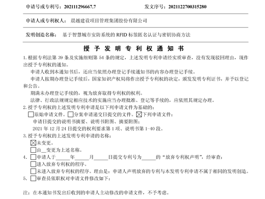 晨越建管統(tǒng)籌旗下企業(yè)技術(shù)中心、院士工作站等高端工程研發(fā)機構(gòu),共研“基于人工智能的智慧社區(qū)綜合服務(wù)平臺”項目,并成功申請發(fā)明專利《基于智慧城市安防系統(tǒng)的RFID標(biāo)簽?zāi)涿J(rèn)證與密鑰協(xié)商方法》。本發(fā)明的目的在于克服現(xiàn)有技術(shù)的一項或多項不足,提供一種基于智慧城市安防系統(tǒng)的RFID標(biāo)簽?zāi)涿J(rèn)證與密鑰協(xié)商方法,極大提升智慧安防系統(tǒng)的安全性、可靠性、穩(wěn)定性。本項目是企業(yè)技術(shù)中心、院士工作站在智慧城市建設(shè)領(lǐng)域的首次技術(shù)突破,將進一步為集團開拓智慧城市咨詢市場、深化信息化咨詢建設(shè)奠定基礎(chǔ)。