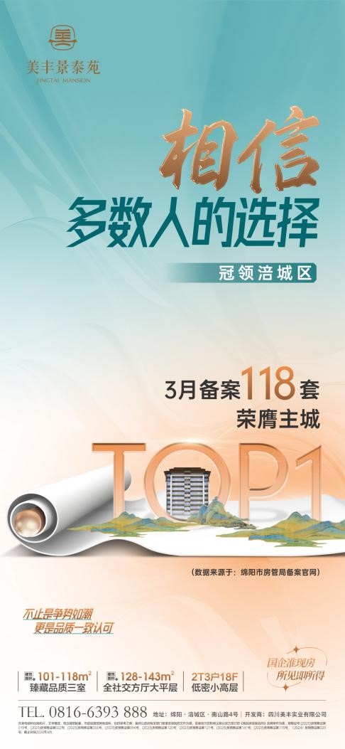 截至3月,美豐景泰苑住宅備案套數(shù)118套,獲綿陽主城TOP1!