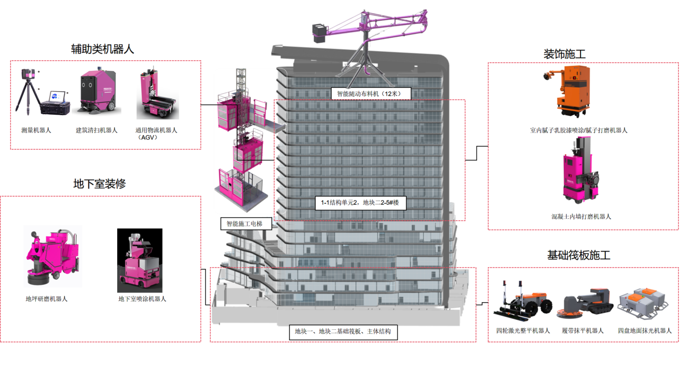 在該項目中,晨越建管集團以BIM技術(shù)、數(shù)字化建設(shè)為抓手,在數(shù)字設(shè)計、智能生產(chǎn)、智能施工、智慧運維、數(shù)據(jù)協(xié)同、綜合效益等多個維度開展智能建造。在設(shè)計階段,運用正向設(shè)計,輔以AI繪圖、BIM綜合協(xié)同設(shè)計等手段提升圖紙質(zhì)量;在生產(chǎn)階段,采用PCMES數(shù)字化管理平臺、智能化設(shè)備、綠色建材等保障構(gòu)件質(zhì)量;在施工階段,綜合運用BIM進行數(shù)字化深化,將運用混凝土施工機器人、裝飾裝修機器人等12款建造機器人投入現(xiàn)場施工,采用起重設(shè)備監(jiān)測、高支模監(jiān)測、周界報警監(jiān)測等10項監(jiān)測技術(shù)保證施工安全;在運維階段,將采用綜合運維平臺,結(jié)合物聯(lián)網(wǎng)、傳感器,實現(xiàn)設(shè)備、能耗、空間、資產(chǎn)數(shù)字化管理。在數(shù)據(jù)協(xié)同方面,本項目采用設(shè)計協(xié)同、施工協(xié)同、BIM協(xié)同等建立數(shù)據(jù)互通網(wǎng),打破了數(shù)據(jù)傳輸桎梏。以上智能建造手段將在工期節(jié)約、人員投入減少、能耗減少、材料損耗降低等方面發(fā)揮重要作用,使項目綜合效益得以顯著提升。