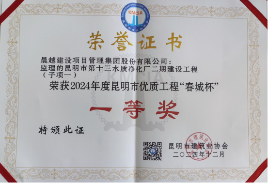 近日,由集團監(jiān)理的昆明市第十三水質(zhì)凈化廠二期建設工程榮獲“2024年度昆明市優(yōu)質(zhì)工程’春城杯’一等獎”榮譽。