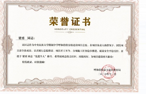 2020年,梁勇受集團委派,擔(dān)任集團中央民族大學(xué)附屬中學(xué)呼和浩特分校建設(shè)項目總監(jiān)。該項目交工日期2021年8月10日,是呼和浩特市重大項目,期間包括一個冬施期,時間緊、任務(wù)重,梁勇深感責(zé)任重大。