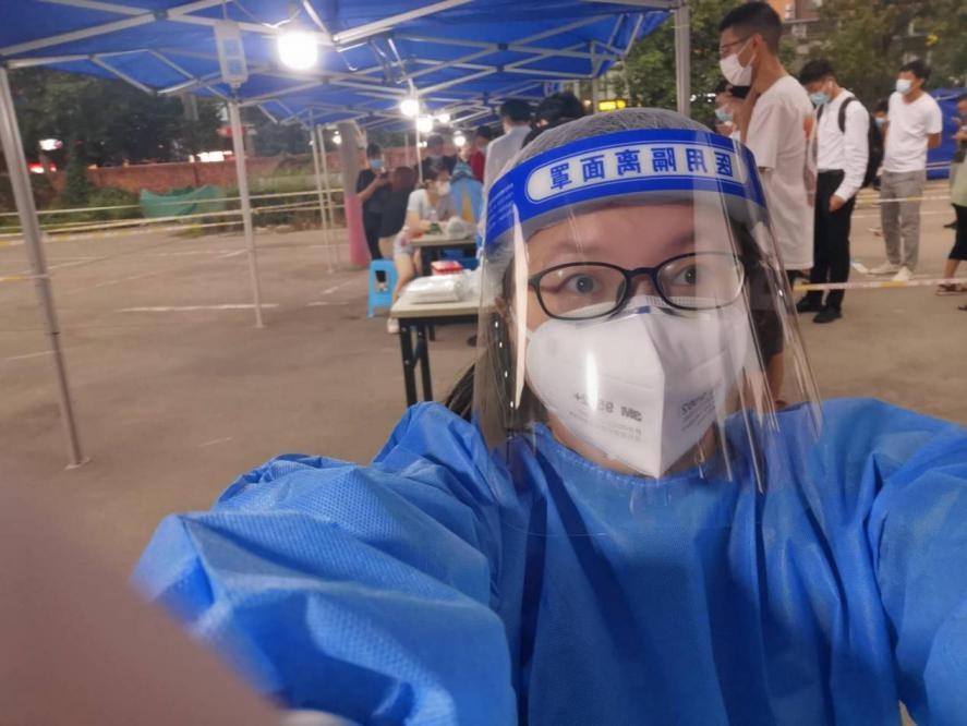 晨越建管集團(tuán)團(tuán)委書記舒琳玲,從8月30日至9月9日,成都市雙流區(qū)中河街道七里社區(qū)總能看到她忙碌的身影,規(guī)劃核酸場(chǎng)地、分區(qū)通知、錄入信息、核酸檢測(cè)......都是她的工作日常。從下午六點(diǎn)到晚上十二點(diǎn)半,每天持續(xù)六個(gè)半小時(shí)的高強(qiáng)度工作,即便是低血糖她也依舊堅(jiān)守在崗位上,她沒有停頓、沒有休息,也從沒有抱怨過一句話!